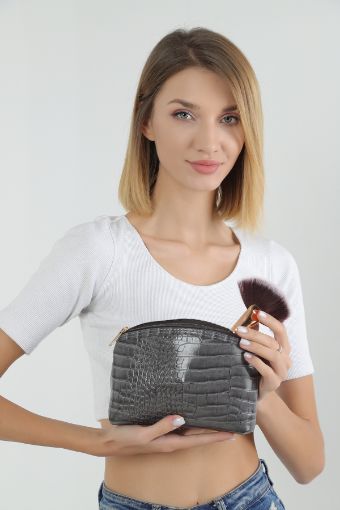 Gri Deri Makyaj Çantası U:16 cm E:23 cm